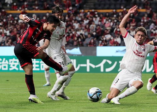 上写真/J1第18節セレッソ大阪戦の前半44分、札幌MFスパチョーク(左)のシュートは、元札幌のC大阪DF進藤(3番)にクリアされ、CKへ逃げられる