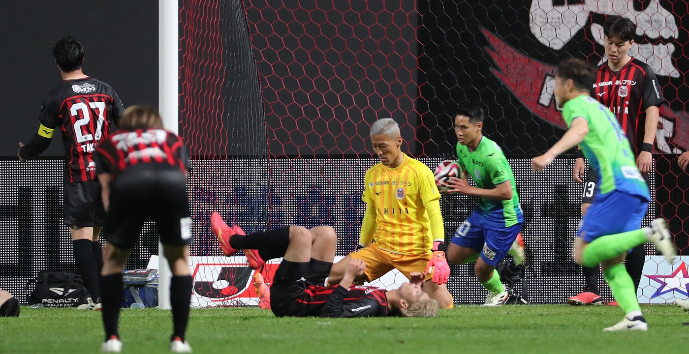 後半追加タイム3分、湘南MF鈴木に同点ゴールを決められ呆然とする札幌の選手たち、左からMF荒野(27番)、近藤、DF中村(中央)、その後方GK菅野、途中出場していたFWキム・ゴンヒ(13番)菅野の右、湘南MF山田がボールを拾い上げセンターサークルに急いでいる。写真は4月27日、札幌ドーム、撮影・石井一弘