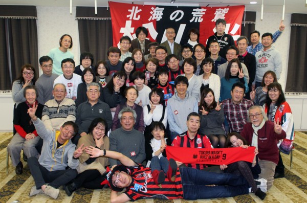 山本雄樹さん夫妻を中心とする北海道コンサドーレ札幌の熱烈サポーターたちの集まり、通称“コンサ一家山本組”の新年会が1月7日(土)、札幌市中央区の南9西1のホテルノースシティーで57人が参加してにぎやかに行われた。昨年J2で優勝してのJ1昇格とあって、例年以上の盛り上がりを見せた。(山本夫人は緊急入院のため参加できなかった)