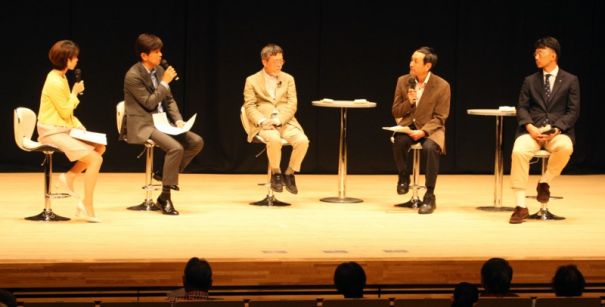 上写真/パネルディスカッション「あなたと選ぶ重大ニュース」で作家・道立文学館館長の池澤夏樹さん(中央)、ジャーナリスト・作家・元朝日新聞東京本社編集局長の外岡秀俊さん(その右)とともにパネラーをつとめた元コンサドーレ札幌・A−bank北海道代表理事・北海道教育大学岩見沢校専任講師の曽田雄志さん(右端)。