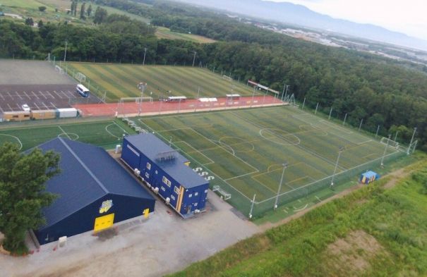 上写真/完成したSSSホーム施設「フットフットスリーエスタージオ」の全体写真。手前左側から三角屋根が多目的屋内交流施設、隣は2階建てのクラブハウス、その裏手に屋外人工芝フットサルコート、右側には省エネ型LEDナイター照明完備の人工芝グラウンド(上の人工芝グラウンドは札幌市内の私立高校所有の多目的グラウンド)。この施設をNPO法人がわずか3年で造り上げた、まさに奇跡的なプロジェクトだ
