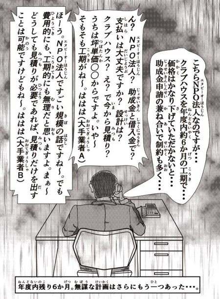 その後、完成した本格設計図を基に建築業者を決める必要があり、設計会社の選定同様、3社以上の見積もり合わせでの施工請負業者選定を行う準備に入った。単純に説明すると価格競争になるのだが、この時すでに2015年9月。土橋が設計図を手に何社かの建築業者に話を持っていくと、特に大手業者からは、詳細説明に進む前に次々と断られた。一部には費用と工期の問題により鼻で笑われて終わったという。