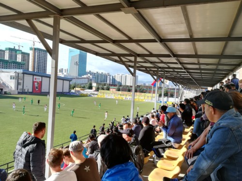 また、人工芝の質にも問題があります。首都のウランバートルにあるスタジアムは、日本のように天然芝の感覚に近いロングパイルの人工芝を採用していますが、地方のスタジアムはテニスコートのような質のカチカチな人工芝です(日本でも初期の人工芝はこうだったと思います)。ここでは、固定式でもスパイクを使用すると逆に滑ってしまうので、私はトレーニングシューズを使用していました。中でもゴールキーパーは厳しいかもしれません。寒い気候や固いグラウンドも含め、サッカーをするにはハードな環境で公式戦が行われています。