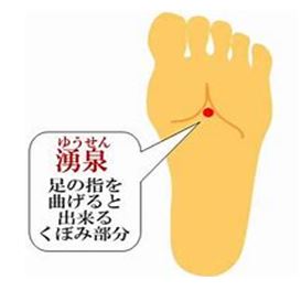 湧泉は、足の人差し指と中指の間をかかとの方に向かってたどると、急に凹んだところ。ここは、足のアーチを作ってくれている足底筋膜がある場所です。なので、ここをゆっくりと押してあげると、脚のポンプ機能が復活。足の冷えによく効きます。