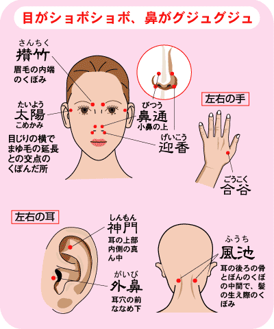 実際の治療では、人によって施術する箇所が違ってきますが、主に手足や顔頭など花粉症に効くツボを探して治療します。