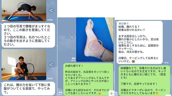 また、実際にけがをしてしまった場合にもLINEを活用しています。足首をねんざしてしまった際、まずは写真に印を付けて痛みの様子をピクシーさんに伝えました。すると、コンディショントレーニングの際と同じように、現時点での的確な対処法を返信して頂きました。この時はかなり足首が腫れてしまったのですが、教えて頂いた対処をすぐに実行したおかげで、なんとか週末の試合に間に合わせることが出来ました。