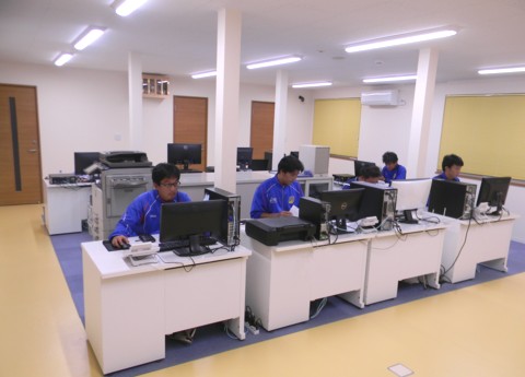 上写真/ホーム施設を一括管理できるように設計されたクラブハウス2階の管理室内の写真。現在は写真のように机やパソコンが並べられているが、竣工時は、中央後ろの神棚があるだけだった