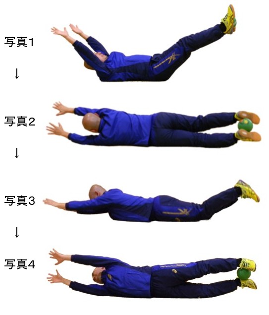⇒手足をできるだけ遠くに伸ばす意識を持ちながら、手足を地面に付けずになるべく連続して行いましょう。また、応用編として、両手でボールを挟んで行うこともできます。ゴールキーパーなどは、セービング体勢の筋力アップにもつながるでしょう。
