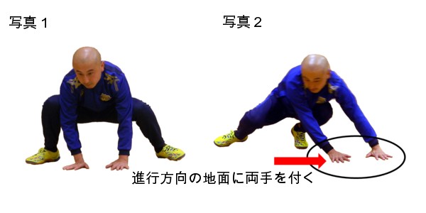 上写真2(右)/写真1の体勢から、両手を体の外側の進行方向(この写真では体の左側)の地面に先に付きます。