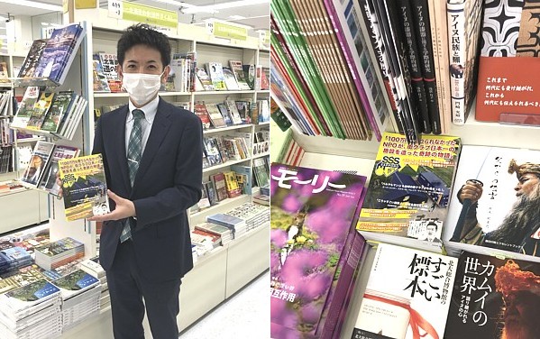 上写真/左側は、陳列された書籍の前で本書を手に取るコーチャンフォーミュンヘン大橋店マネジャーの林隆治さん。右側は、陳列された書籍写真。
