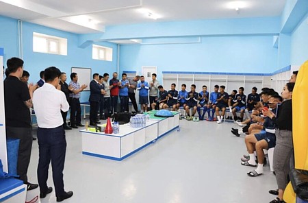 続いて、普段は選手やチーム関係者しか立ち入ることのできない、ロッカールーム内部の様子をご紹介します。まず、2019年にロッカールーム内部は綺麗にリフォームされました。以前もベンチやシャワールームなど最低限の設備はあったのですが、現在はより近代的なサッカースタジアムとなっております。各選手が着替えなど行えるようにパーテーションで区切られた専用のロッカーがあり、マッサージ用のベッドや作戦ボードも準備されています。また、ロッカールームからスタジアムに抜ける廊下は、かつてのモンゴルサッカー界の歴史が振り返れるように、多くの写真やパネルが壁一面に飾られています。これは、選手側からするとモチベーションが高まる要因の1つとなりそうですね。この廊下を抜けて階段を駆け上がると、スタジアムのピッチにつながっています。
