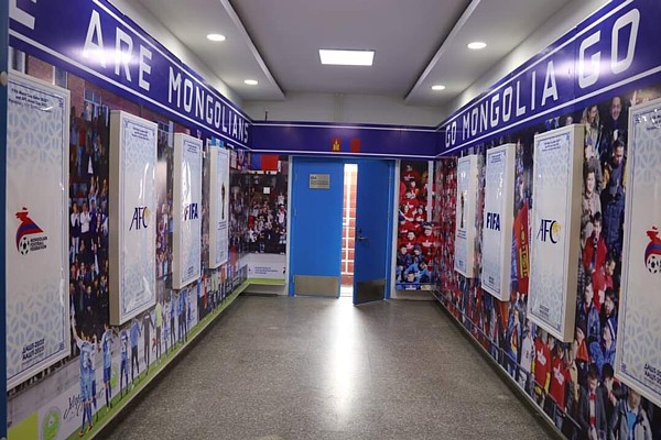 下写真/ロッカールームからピッチにつながる廊下。モンゴルサッカーの歴史も感じながらモチベーションも上がる