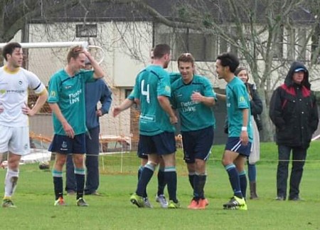 上写真/アラン・ピアーズ選手のゴール後、チームメイトたちから祝福を受け、信頼の高さもうかがえる