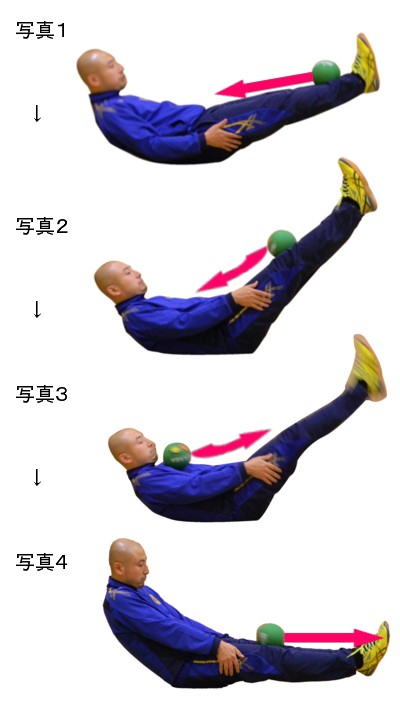 上写真1(最上段)/足の先にボールを置き、頭と足を地面から上げ、体全体をゆりかごのように丸めます