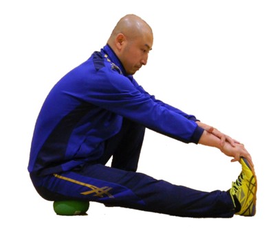 上写真/伸ばす方の足の坐骨(ざこつ。立った状態でお尻を触って、前屈した時に出っ張るお尻の骨)の下にボールを置きます。片方のお尻(写真では右側)でボールに座るような感覚です。反対の足(写真では左足)はひざを立てて地面に付けバランスを取ります。伸ばす方の足(写真では右足)はひざを伸ばして、両手でつま先をつかみます。
