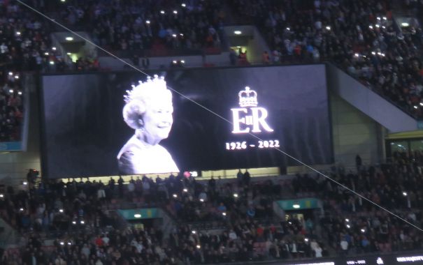 上写真/同日、スタジアム内で電光掲示板に映し出された英国の故エリザベス女王に黙とうがささげられた。(写真はいずれも伊藤庸夫氏提供)