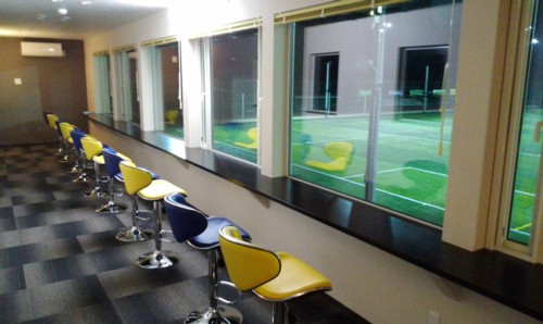 上:下段写真/おしゃれなラウンジにも見える特別観覧席。海外クラブのクラブハウスをイメージして設計されており、グラウンドを一望出来る。LEDナイター照明点灯時には緑に輝くように見えるグラウンドは見事で、サッカー関係者がうなるというのも納得だ
