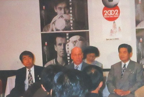 上写真/1996年5月、FIFA総会(スイス・チューリッヒ)での記者会見。左からJFA岡野氏、ボビー、川渕氏