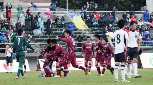 上:上段写真/高校サッカー決勝で優勝を決めた瞬間、膝をつく決勝点をあげたDF遠藤に駆け寄って喜び合う旭川実業の選手たち。敗れた大谷室蘭のキャプテンMF小栗(8番)、DF広瀬(10番)はがっくりとうなだれる。左端旭実GK永井(1番)