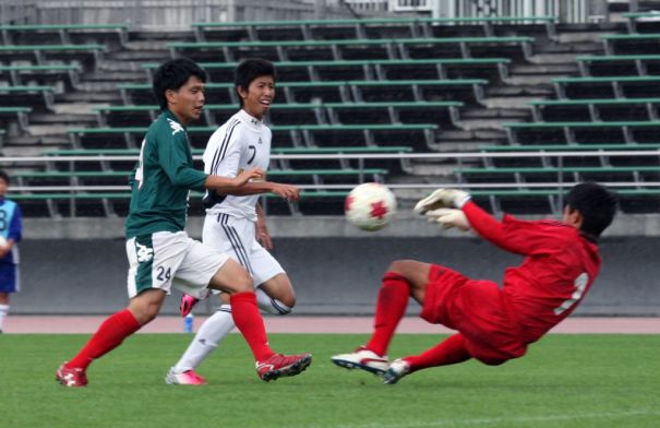 上写真/8月31日、天皇杯全日本サッカー1回戦、北海道教育大学岩見沢校―羽黒高校(山形代表)。前半28分岩教大FW近藤(24番)は羽黒高DF渡部翔(7番)を振り切ってGK渡部悠(右)と1対1になるが惜しくも止められる=別建て記事「第93回天皇杯はコンサドーレ札幌が3回戦へ」参照。
