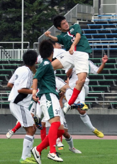 上:上段写真/2分前に羽黒高に先制された岩教大は前半33分、右CKからDF葛西(14番)が高いジャンプのヘディングシュートを決め同点とする