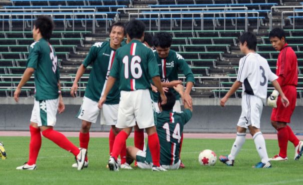 上:下段写真/前半33分同点ゴールを決めた岩教大のDF葛西(14番)に集まりチームメイトが手荒い祝福。羽黒高GK渡部(右端)、DF大木(3番)が恨めし気