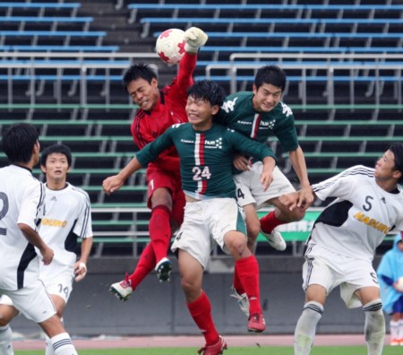 上:上段写真/後半39分岩教大はFKからMF志田(左端)がヘディングシュートを決め逆転する。羽黒高GK渡部(1番)、その左FW柿崎(18番)