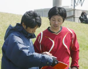 上写真/ベアフット北海道との試合開始前打ち合わせをする古川ヘッドコーチ(左)と試合に先発出場する池内コーチ
