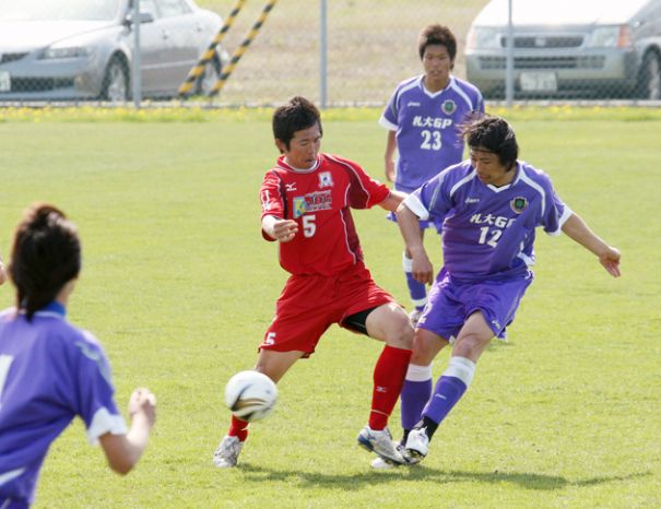 一方、札大GPは昨季までコンサドーレ札幌で活躍した池内コーチがセンターバックとして先発フル出場し、ベアフット北海道に1−0で初勝利をあげた。後半、FW西村の上げたゴールを池内らが守りきった。指揮をとった古川ヘッドコーチは「池内が入り守備に軸ができた。今後も道リーグには出場させる」という。池内は「もっと、点が取れたと思う。久し振りの芝生の上での試合で気持ちが良かった」と笑顔を見せた。