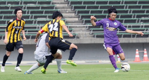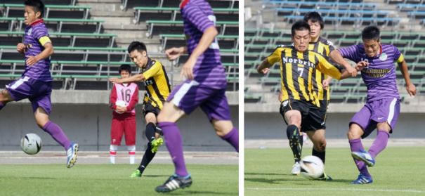 上:上段右側写真/延長後半11分、札幌大学キャプテンDF菅原(10番)のシュートを懸命に守るノルブリッツ北海道MF赤坂(7番)。延長に入り札幌大学は圧倒的に攻めたが、ノルブリッツ北海道が守りきった
