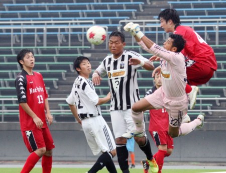 上:上段写真/後半22分?、途中出場したノルブリッツのFW山田(右端)が同点ゴールを決める。左端tonanサテライトのDF星野(4番)