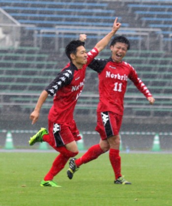 上:下段写真/後半22分?、同点ゴールを決め喜んでベンチへ走るノルブリッツFW山田(左)とMF名雪(11番)