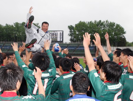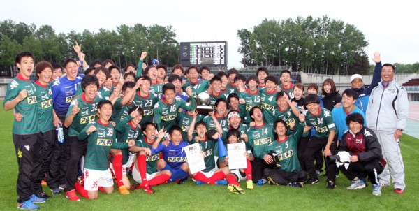 上写真/第41回総理大臣杯全日本大学サッカートーナメント北海道大会決勝で札大を破って優勝し、喜びを爆発させる北海道教育大学岩見沢校の選手、スタッフたち。右端が越山賢一監督