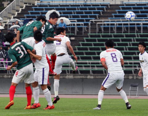 上:上段写真/前半33分、道教大岩見沢FW佐賀(グリーンのユニホーム左から3人目の9番)が、左CKからのボールをヘッドで決めて先制する。その左DF重森(8番)、左端佐藤(31番)、右の8番はキャプテンマークを巻いた札大DF中島