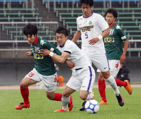 第41回総理大臣杯全日本大学サッカートーナメント北海道大会決勝は5月28日、札幌厚別運動公園競技場で行われた。1977年に始まったこの大会、最多出場25回目の札幌大と9回目の北海道教育大岩見沢校の対戦になり小雨降る芝ピッチで始まったが、観客は2百人程度で少数。これは大会規定で本道代表が2校(東北地区と隔年1校増)になったためで、札大は道都大との4−0、岩教大は北海道大の4−1で、準決勝突破。前日に代表権を得ていた、いわば順位決定戦だったためか。