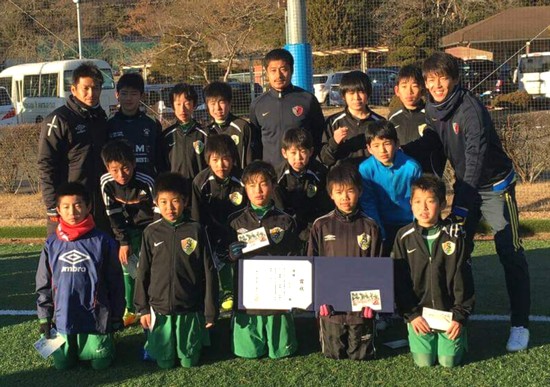 上写真/2017年1月6日、「第1回東北人魂カップin松島」で優勝した塩釜FCジュニアのメンバー。写真後列中央が発起人の鹿島MF小笠原満男選手、右端が同じく鹿島DF山本脩斗選手、左端が塩釜FC出身の鹿島MF遠藤康選手