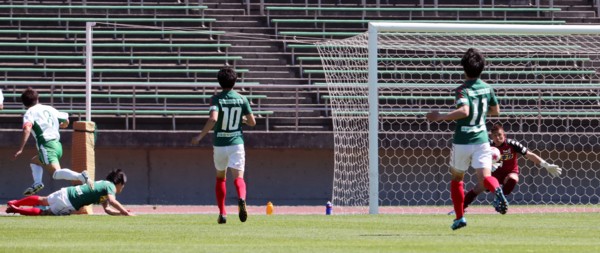上:上段写真/後半追加タイム2分、岩教大途中出場のMF野村の右CKからMF小川(24番)が頭で折り返したボールをDF遠藤(17番)が左足で決めて同点とする。中央倒れているのがFW下田(33番)、左端韮崎アストロスGK川村