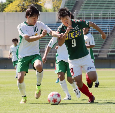 上:下段写真/後半31分、岩教大FW佐賀(9番)と韮崎アストロスのMF飯塚(10番)が厳しいマッチアップ。佐賀は自身のゴールは成らなかったが、5本のシュートを放つなどチームを引っ張り、勝利に貢献した