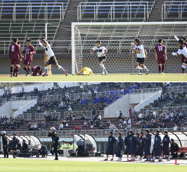 上:4段目写真/前半で1−1に追いついた旭実イレブン。メインスタンドは期待の一戦で2千人の観衆が詰めかけていた