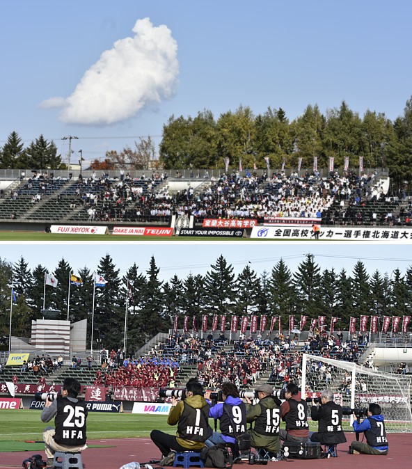 今回の大会には、気の毒なことが発生していた。競技場の隣りを高速道路が走っている。試合開始時間に「到着するはず」が、事故で通行止めだった。室蘭方面だったので、「室蘭応援団は、間に合ったのだろうか」。この後、秋晴れの真っ青の空に、一塊の雲がよどんでいた=下写真=。不気味なぐらいだった。(池田 淳)
