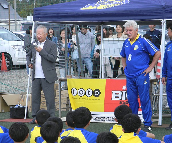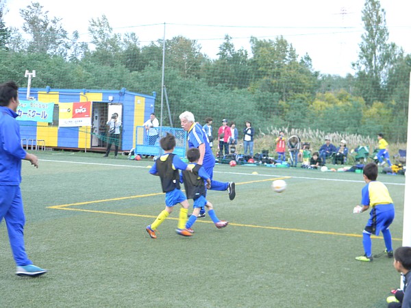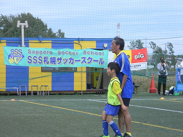 交流試合では、金田氏とマリーニョ氏、元Jリーガーで現SSSスタッフの山瀬幸宏コーチの特別チームが結成され、子どもたちと対戦。往年のテクニックとドリブルやパスワーク(時には話術)で、子どもたちを刺激し続け、観覧者を含め終始温かい雰囲気に包まれていた。