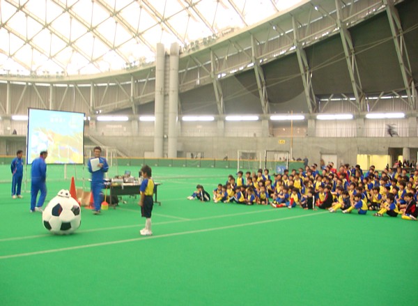 「サッカーの集い」始球式の様子。ビックボール君の出現に子どもたちも大喜び。 写真提供:SSS札幌サッカースクール