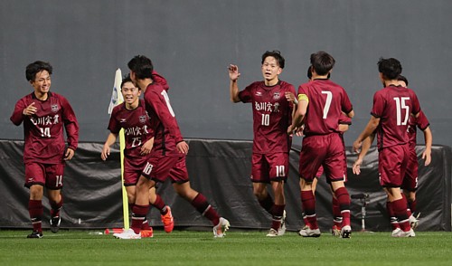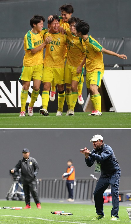 上:上段写真/延長後半2分、北海右FKからの攻撃でDF武笠の折り返しを渡部(5番)が右足でゴールを決め、チームメイトに手荒い祝福を受け笑顔を見せる、結果的にこれが決勝点となった