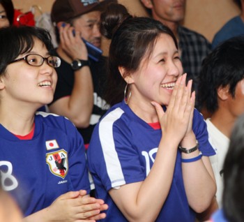 上写真上段/日本の予想以上の健闘に笑顔で応援する女性サポーター