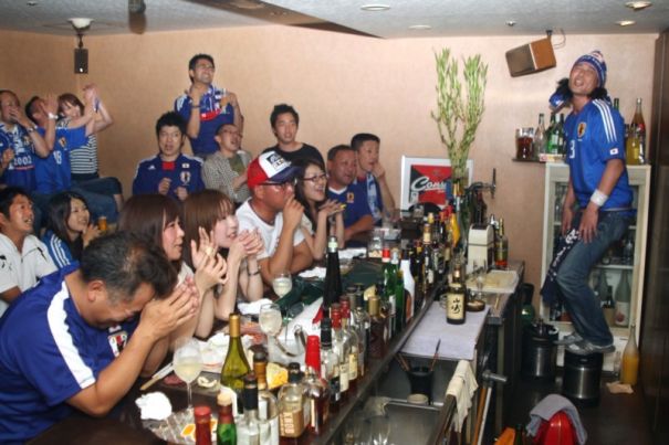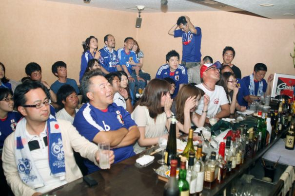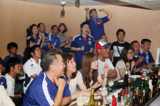 札幌市中央区で、元コンサドーレ札幌の川合さんが切り盛りする飲食店「ドンベー」に、日本代表を応援するサポーター約40人が集まり、6月19日のオランダ戦をテレビ観戦した。