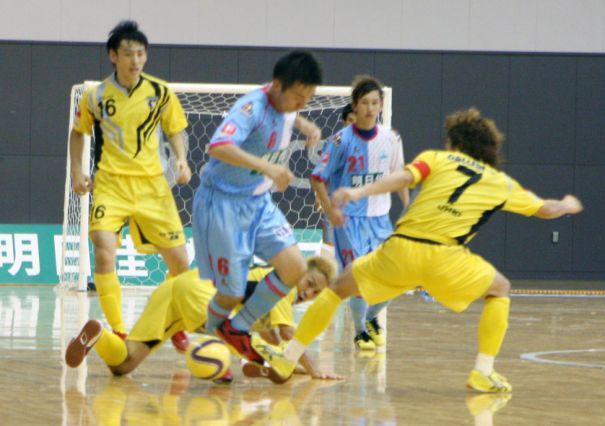 下段写真/後半3分コート中央付近でボールを奪い合うエスポラーダの嵯峨(6番)とペスカドーラのキャプテン金山(7番)。奥の21番がエスポラーダ期待の新人18歳の室田祐希、前半に初ゴールを決めた。左端ペスカドーラの篠崎(16番)