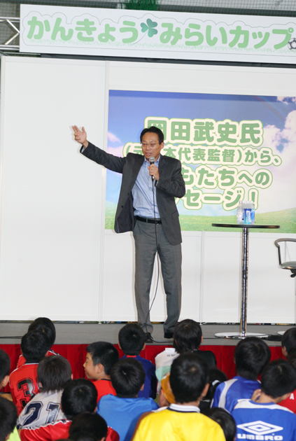 岡田さんは、コンサドーレ札幌の監督(1999−2001年)をして、Jリーグの監督や代表監督をしており、子どもたちはテレビで見たことのあるおじさん―と興味津津だった。