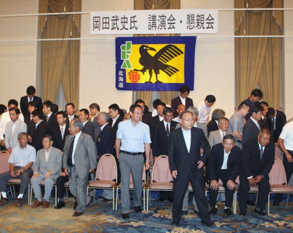 上:下段写真/北海道サッカー協会主催の講演会、懇親会で記念写真を撮り終えた岡田武史元日本代表監督(中央左)と出口明道協会会長(その右)ら協会の役員たち