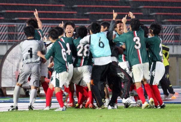 上:上段写真/大学の強豪・大体大をPK戦の末に破り金星を上げ、指を突き上げて大喜びする岩教大の選手や関係者たち