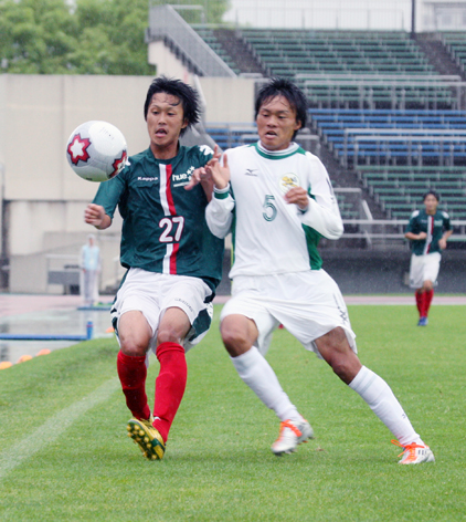 上:上段写真/前半17分右サイドで大体大DF馬場(5番)と激しくマッチアップする岩教大MF阿部。阿部はこの2分後、先制点を決めるなど勝利に貢献した